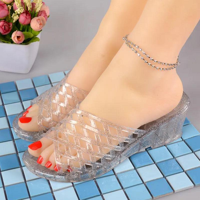 Fashion High Heel Crystal Slippers Girls Summer Transparent Plastic Sandals Wedge Heels Bathroom Thick Bottom Outdoor