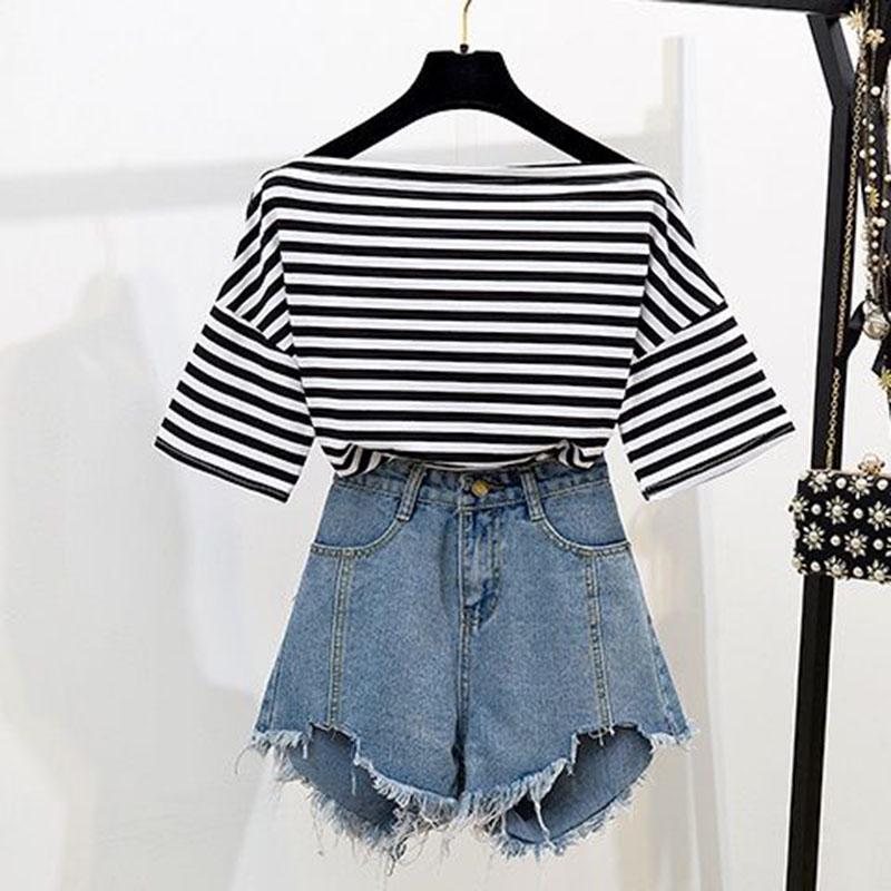Fashion Shorts Suit Summer Off Shoulder Striped T-shirt Ripped Denim Shorts Two-Piece Casual Outfit