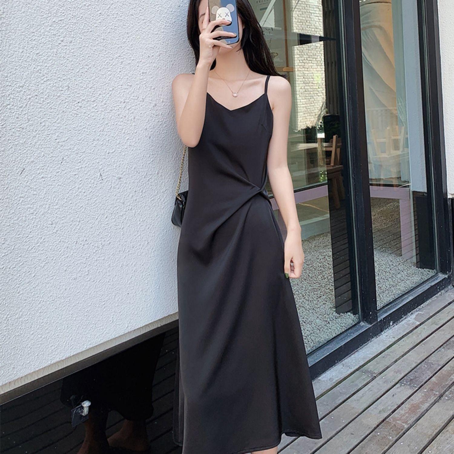 Female Summer V-neck Satin Medium Length Simple Casual Light Mature Style Korean Elegant One Piece Bottom Strap Dress