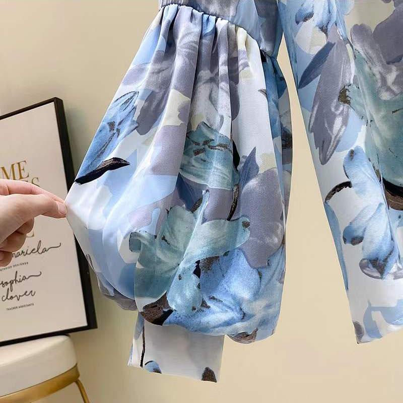 Floral Chiffon Puff Sleeve Top Thin Chiffon Shirt Women's Loose Casual Top Stand Collar Long Sleeves