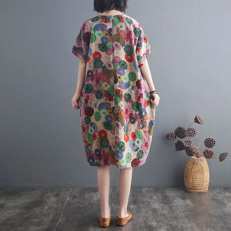 Flower Print Dress Women's Short-sleeved Round Neck Mid-length Floral Dress