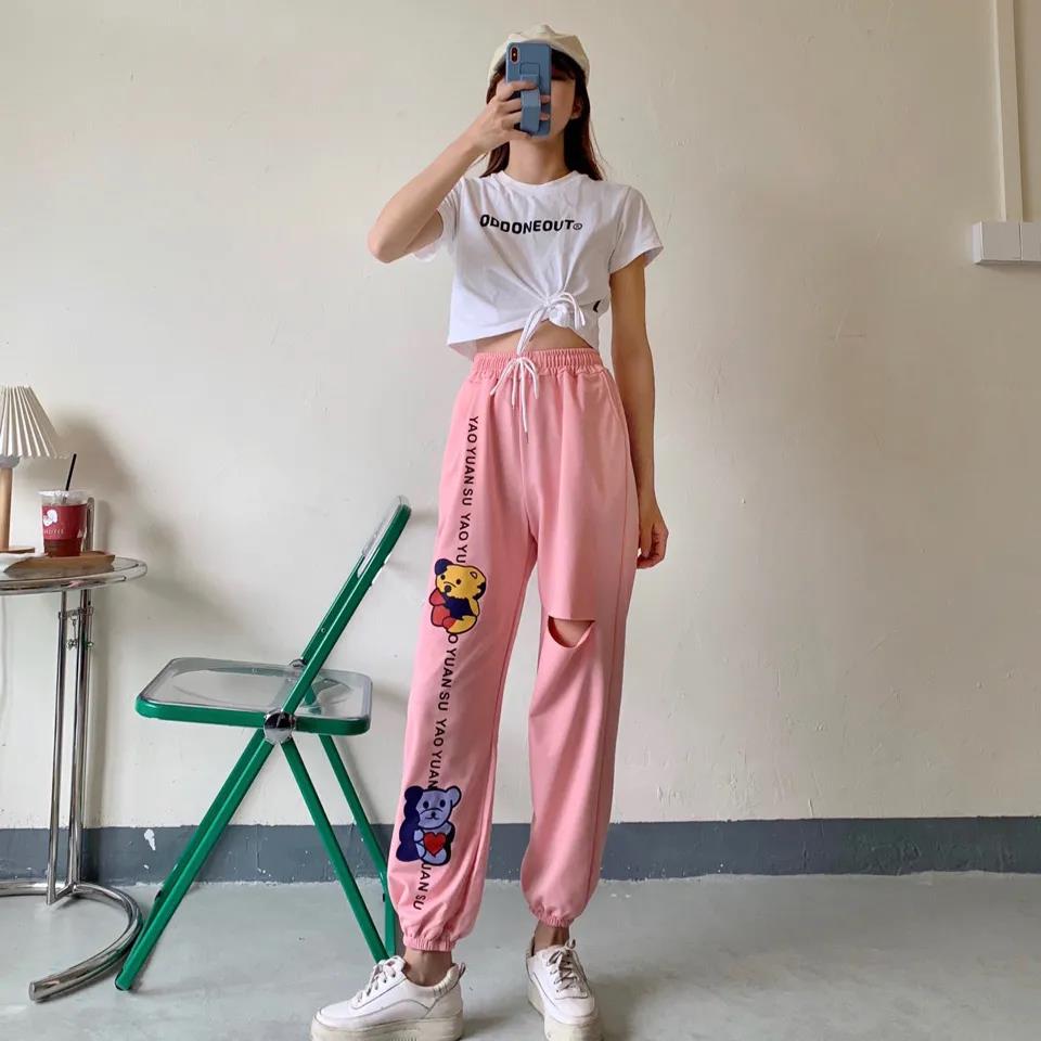 Girls Pants Summer High Waist Slimming Sports Running Students Beggars with Holes In Nine-point Guard Pants