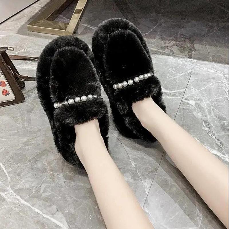 Hairy Pearl Casual Flat Shoes Shoes Women's Outer Wear Warm Soft Cotton Shoes Casual Peas Shoes Plus Velvet Platform Moccasin Shoes