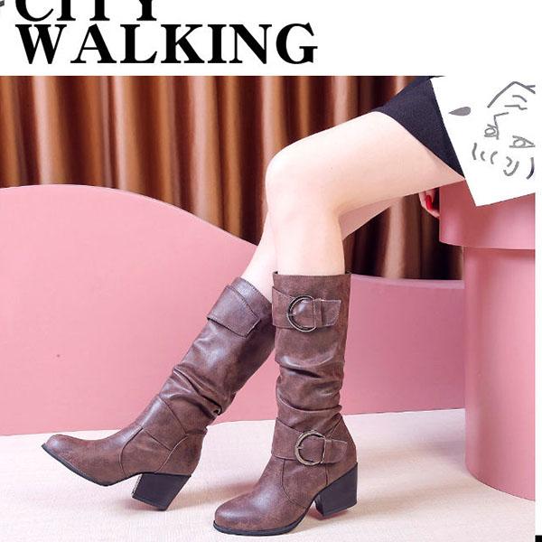 Leather Buckle High-heel Knee-High Boots Women's Leather High Boots Thick-heeled Knight Boots Plus Size 35-43 Cowboy Boots