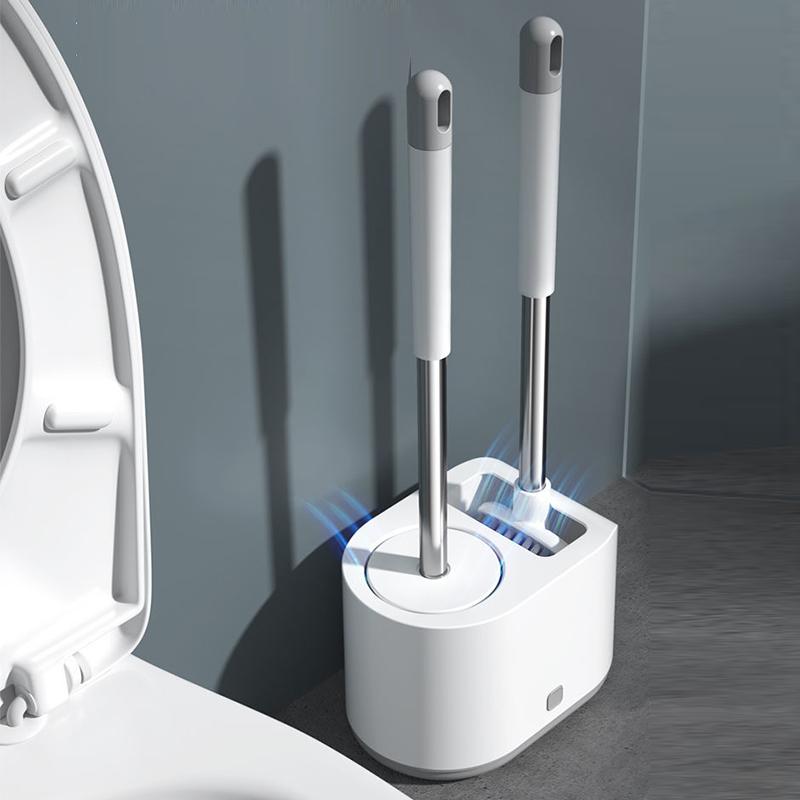 Toilet brush and plunger set stores near the toilet in an all which makes for a convenient storage option for the restroom.