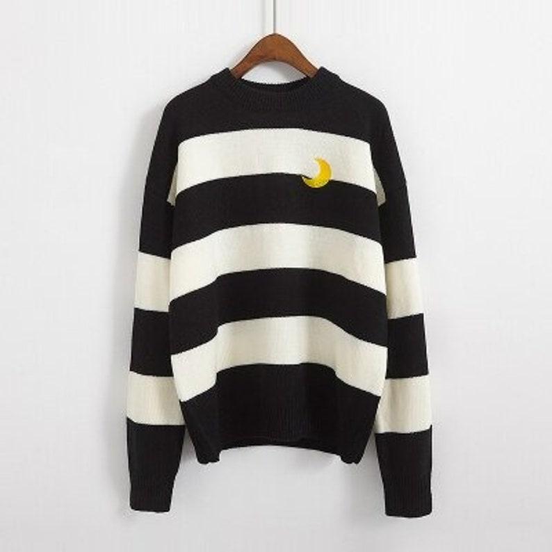 Pastel Lilac Sailor Moon Theme Knit Jumper, Candy Color Stripes Moon Sets Embroidery Sweater Harajuku Clothing, Kawaii Clothing Cute Sweater