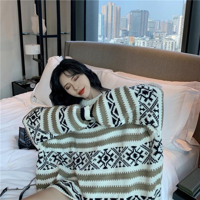 Pofulove round neck sweater women autumn and winter loose sweater jacquard long-sleeved thick