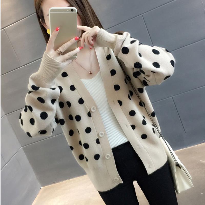 Polka Dot Short Knit Top Loose College Style V-neck Sweater Fashion Casual Jacket Women