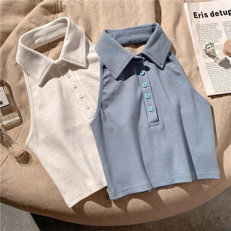 Polo Shirt Collar Halter Camisole Women Outerwear Summer Sexy Open Back Girl Slim Short Crop Top Solid Color Temperament Sleeveless Halter Vest Top