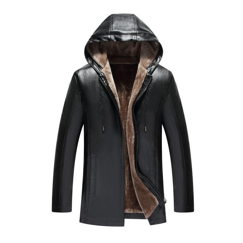 Pure Color Men's Casual Leather Jacket Plus Velvet Thick Leather Jacket Hooded Leather Jacket Men