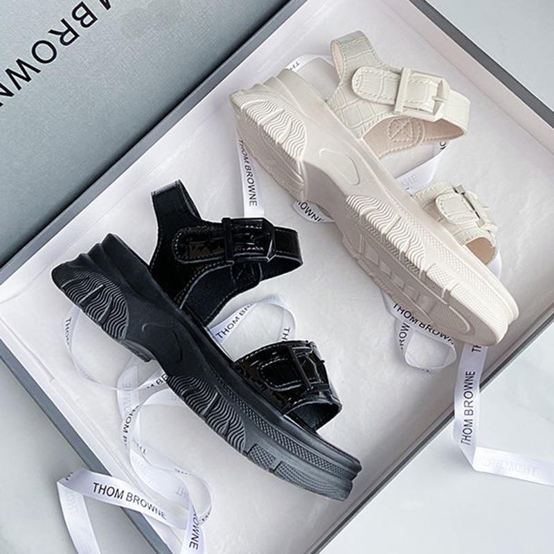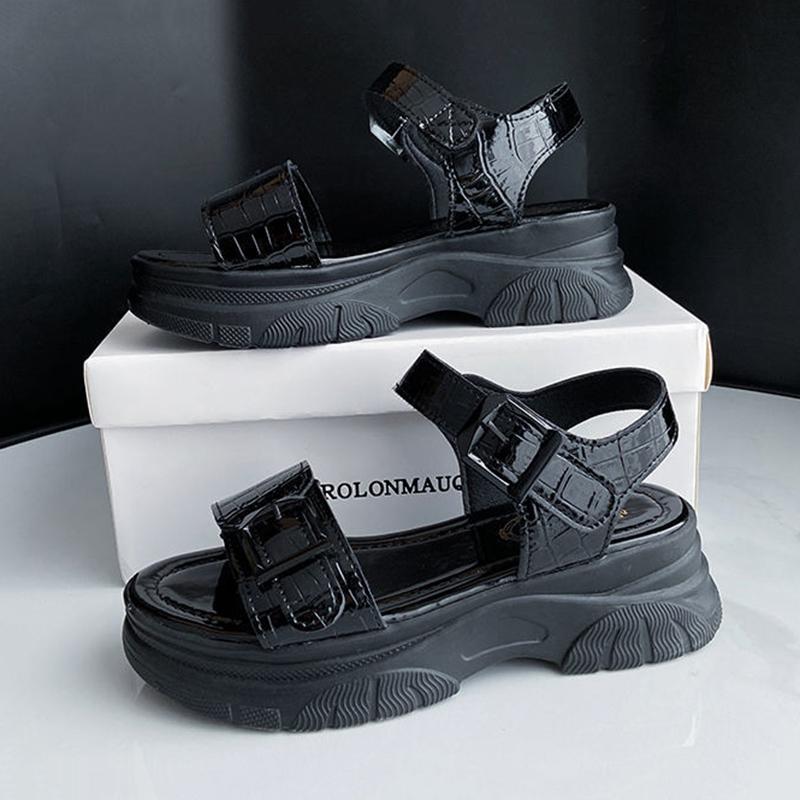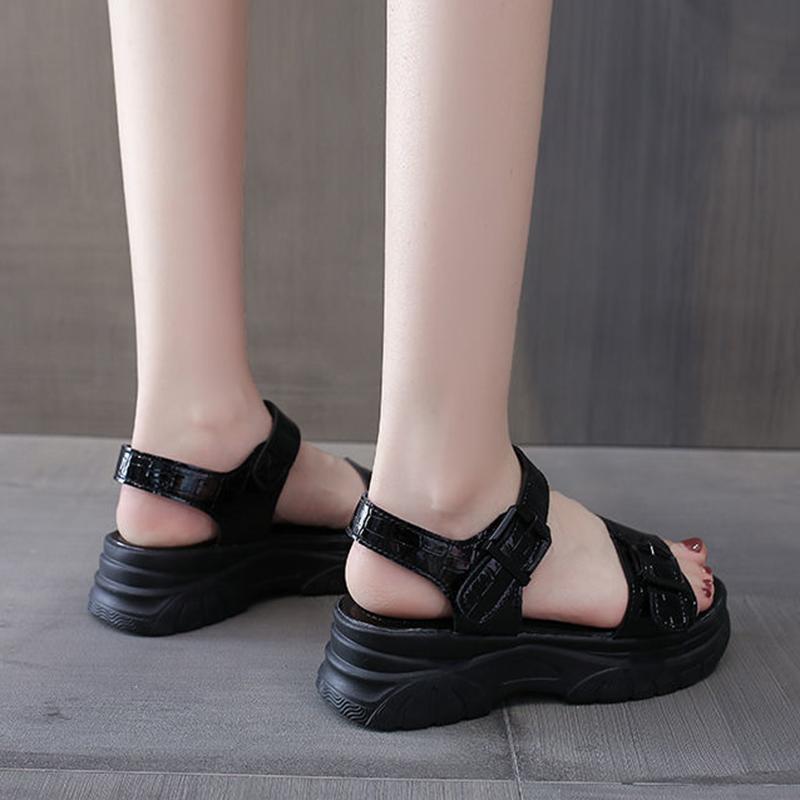 Sandals Women's Summer All-match Flat Shoes Non-slip Thick-soled Ladies Roman Shoes Black Glossy Simple Sports Casual Sandals