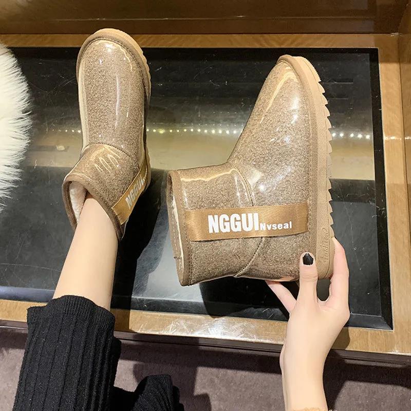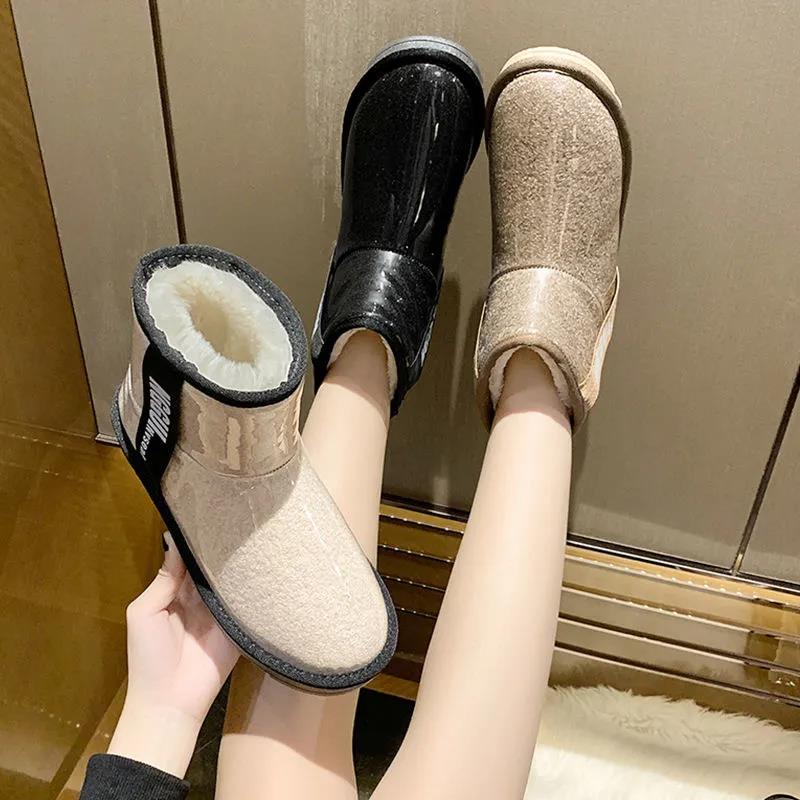 Snow Boots Women Winter Short Tube Transparent Waterproof Boots Korean Style Plus Cotton Shoes