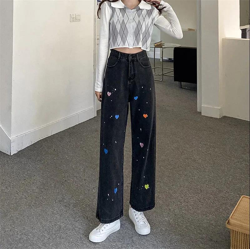 Spring and Autumn High Waist Jeans Women's Loose Thin Wide Leg Love Embroidered Pants Japanese Thin High Waist Casual Pants