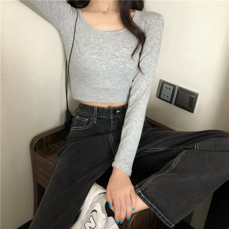 Spring Fall Summer Fashion Women Clothes Cotton Round Collar Long Sleeves Elastic High Waist Sexy Pullover