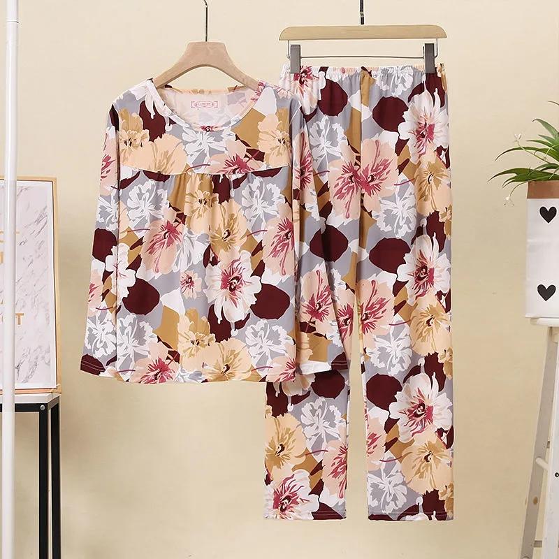 Spring Summer Pajamas Set for Women Long-sleeved Floral Printed Home Wear Two-piece Set Middle-aged Elderly Flowers Loose Large Size Pajamas