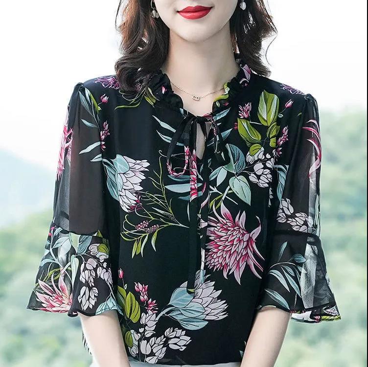 Summer Chiffon Shirt Women's Loose Plus Size Printed Shirt Doll Collar Top