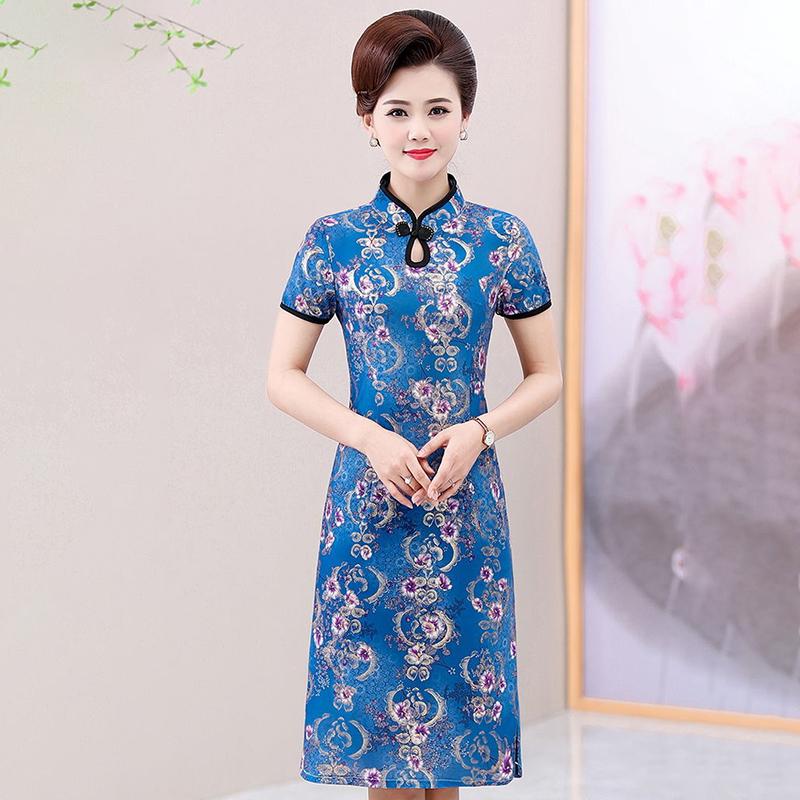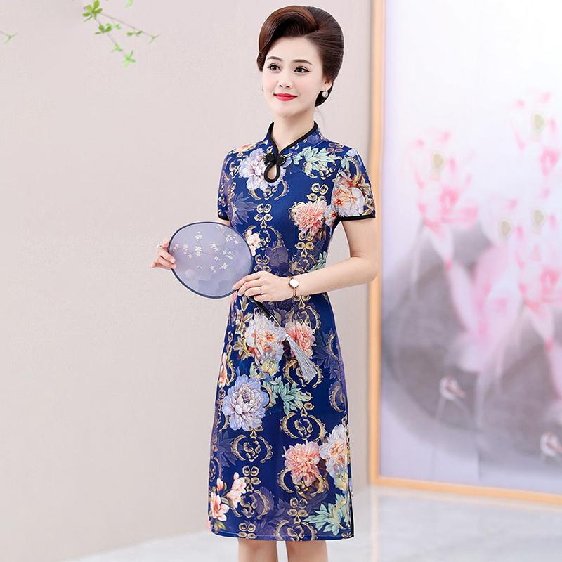 Summer Improved Cheongsam Female Mother Dress Retro Short-sleeved Dress Mid-length Middle-aged and Elderly Printed Cheongsam Dress
