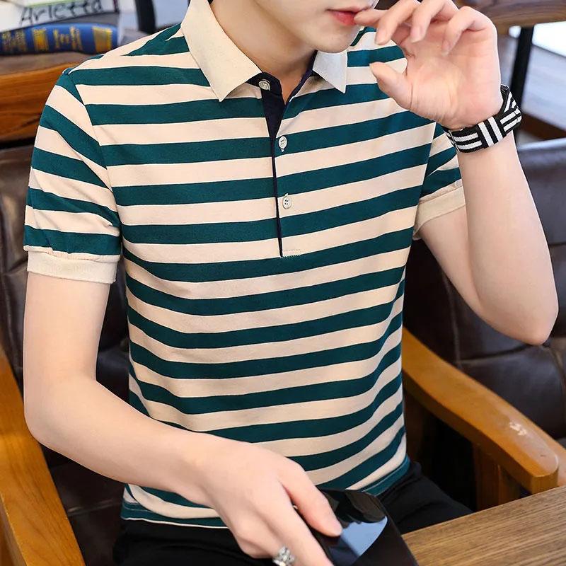 Summer Short-sleeved T-shirt Handsome Striped Lapel Slim Middle-aged Men's Color-blocking Top