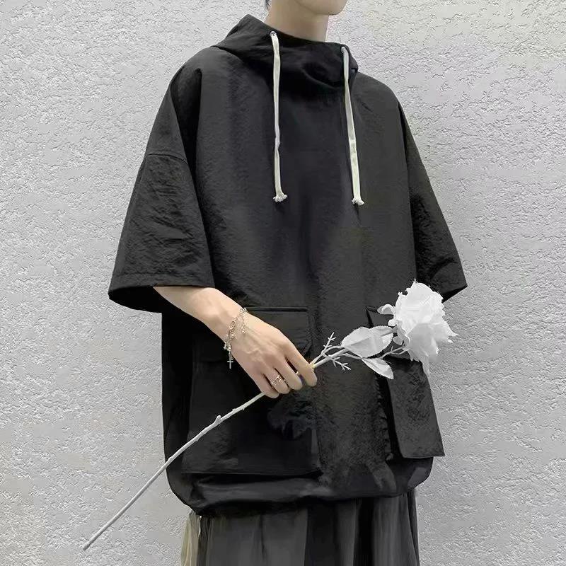 Summer Thin Hooded Students All-match Short-sleeved T-shirt Men's Trendy Design Sense Tooling Five-point Half-sleeved