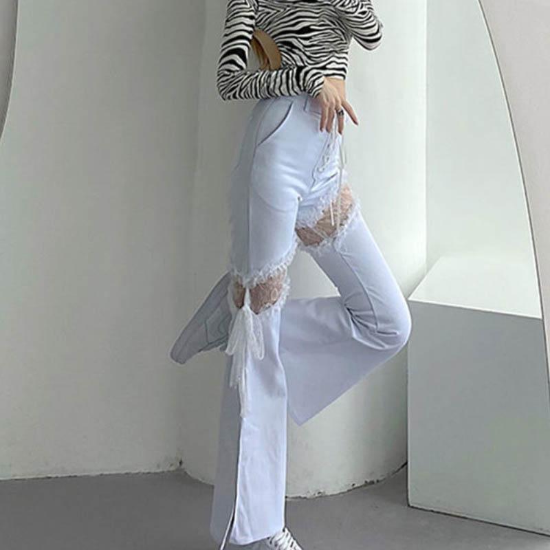 White Openwork Fork Jeans High Waist Thin European and American Style Splicing Bell Pants