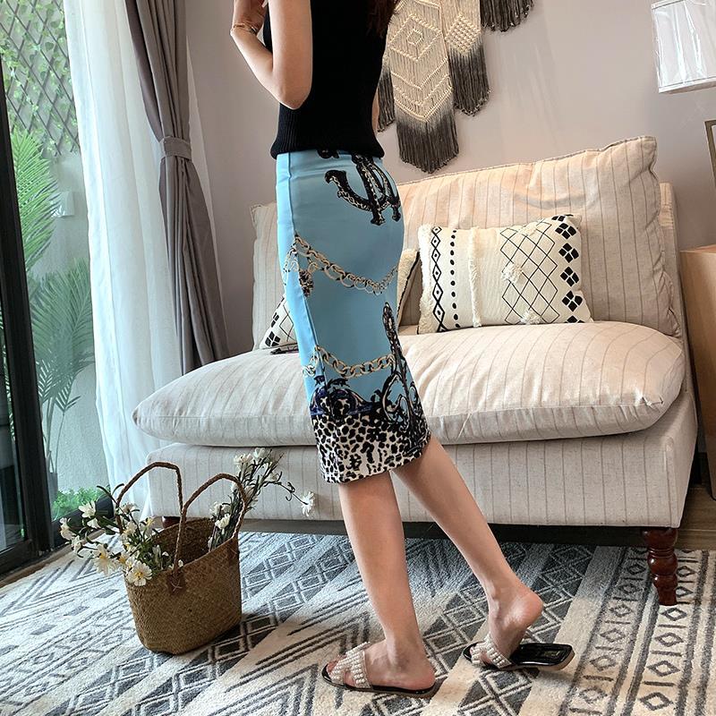 Women Gemetroc Printed High Waist Elasticity Slim Office Lady Pencil Skirts Summer Cool Breathable Knee-length Skirt with Slit
