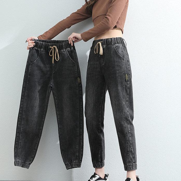 Women Spring and Autumn Large Size Streetwear Cropped Jeans Loose Solid Color High Waist Elastic Casual Jeans