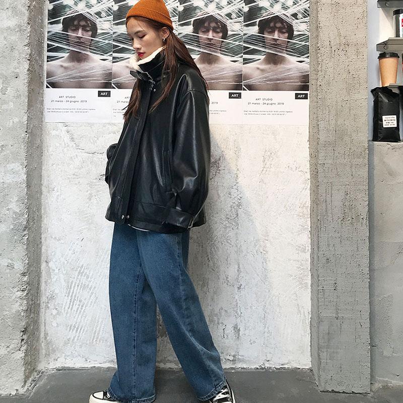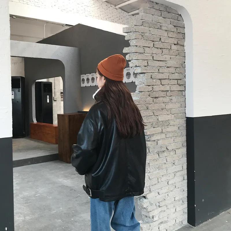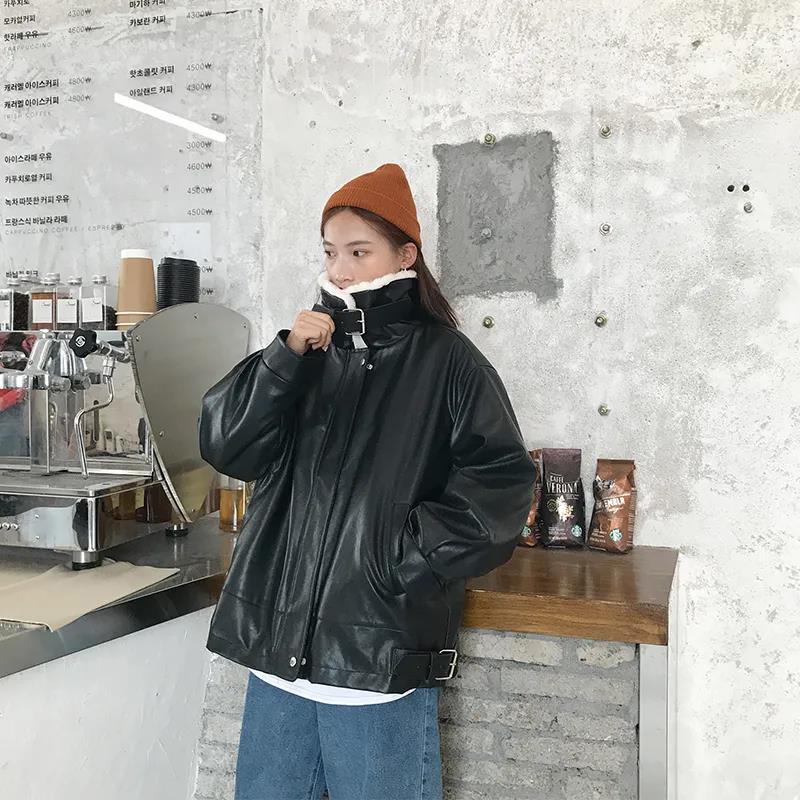 Women Winter Coat Loose Warm Faux Fur Collar Flocking Leather Jacket Windproof Short Black PU Leather Jacket