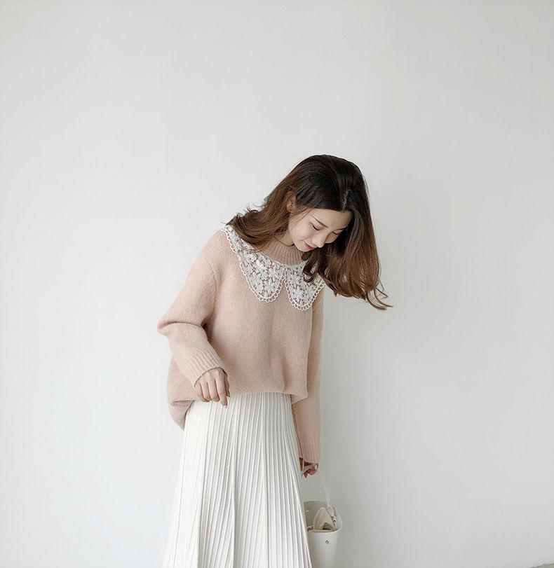 Women's Autumn and Winter Sweet Baby Collar Lace Sweater Large Size Pullover Knitted Bottomed Shirt Solid Color Lace Casual Top