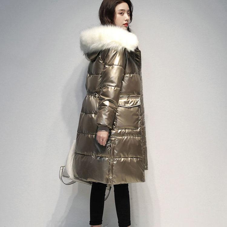Women's Bright Face Hooded Down Jacket Long Loose Thick Coat Warm Cotton Coat Large Wool Collar Winter Quilted Coat