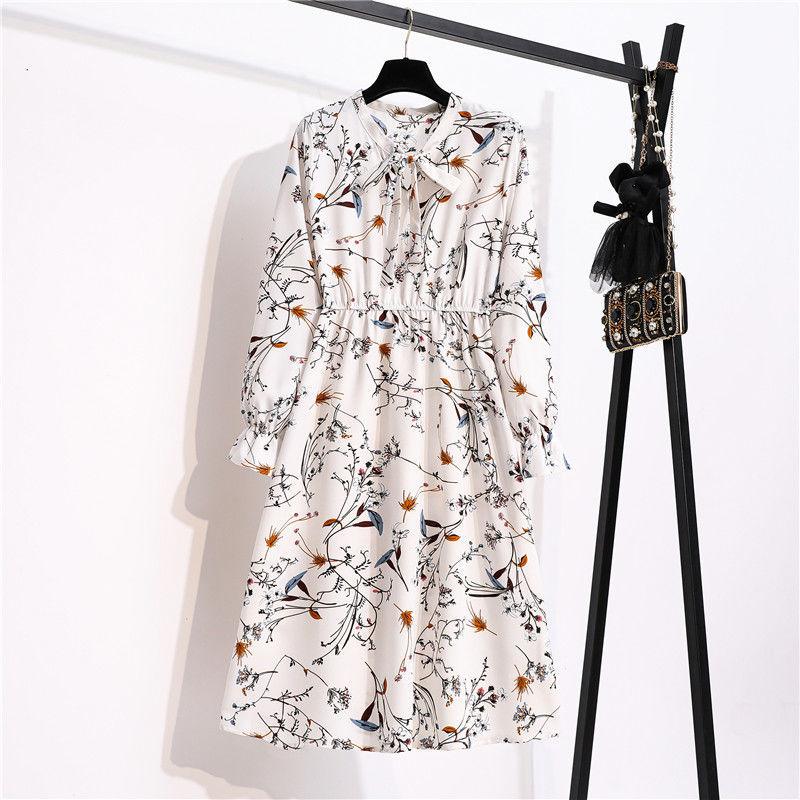 Women's Chiffon Dress Female Vintage Floral Printed Long Sleeve Bow Midi Dresses Spring Autumn Flare Sleeve
