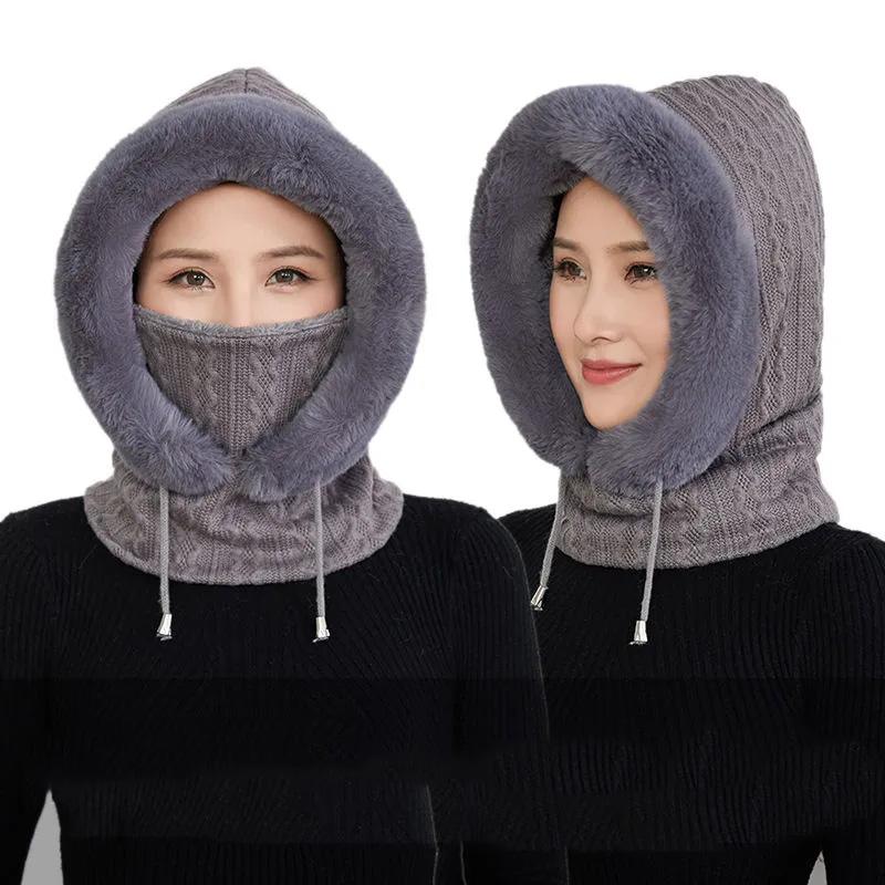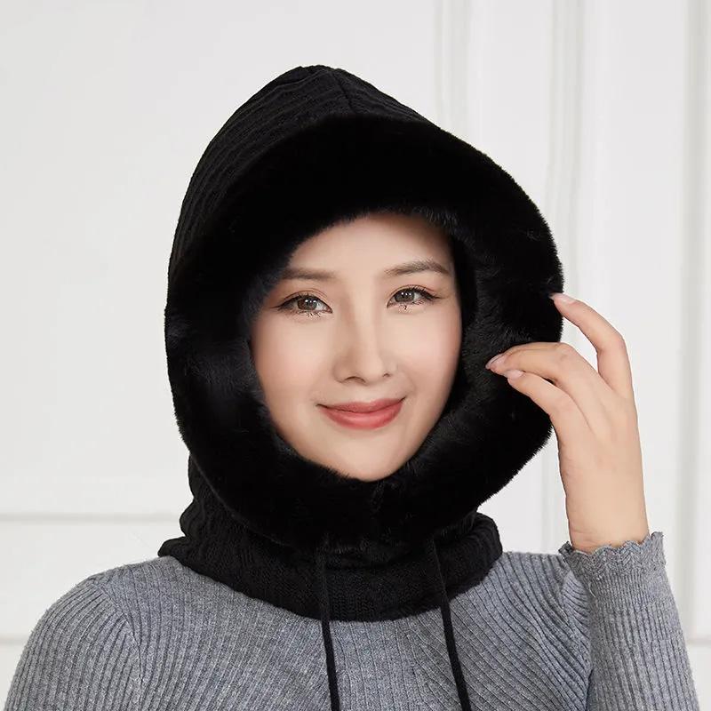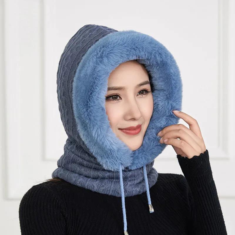 Women's Hat Plus Velvet Thick Warm Windproof Hood Ear Neck Protection Knitted Hat Woolen Cap Winter One-piece Cap Scarf Set