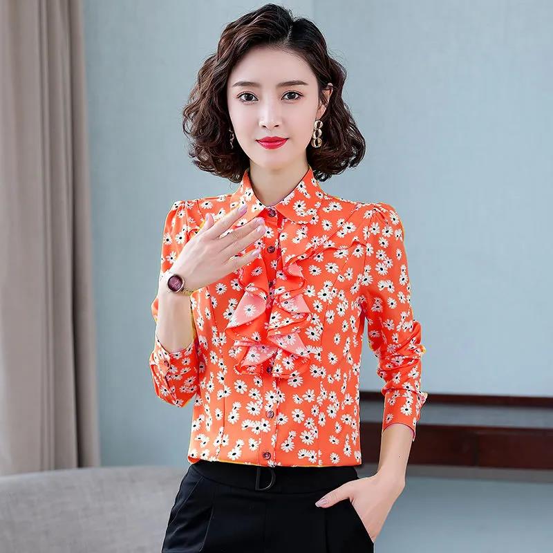 Women's Spring and Autumn Chiffon Shirt Loose Sweet Long Sleeve Printed Top