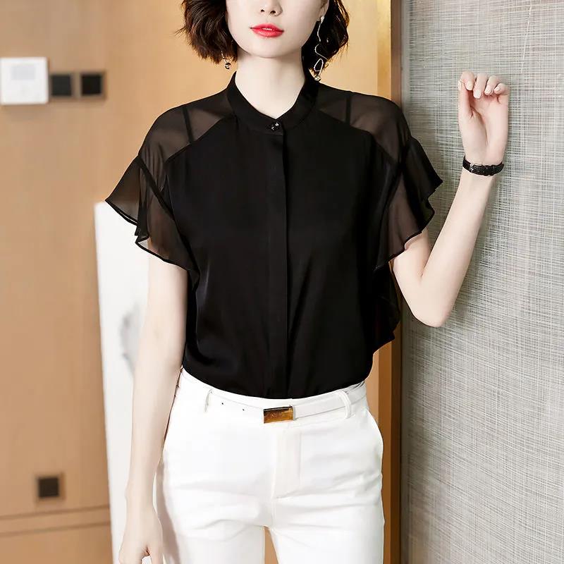 Women's Summer Chiffon Shirt T-shirt Loose Top Solid Color Short-sleeved Round Neck Shirt