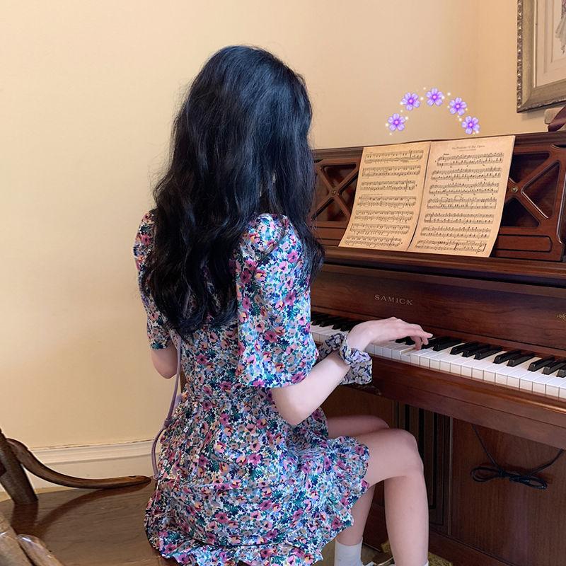Women's Summer Short French Elegant Retro Waist Slim V-neck Little Fresh Floral Dress