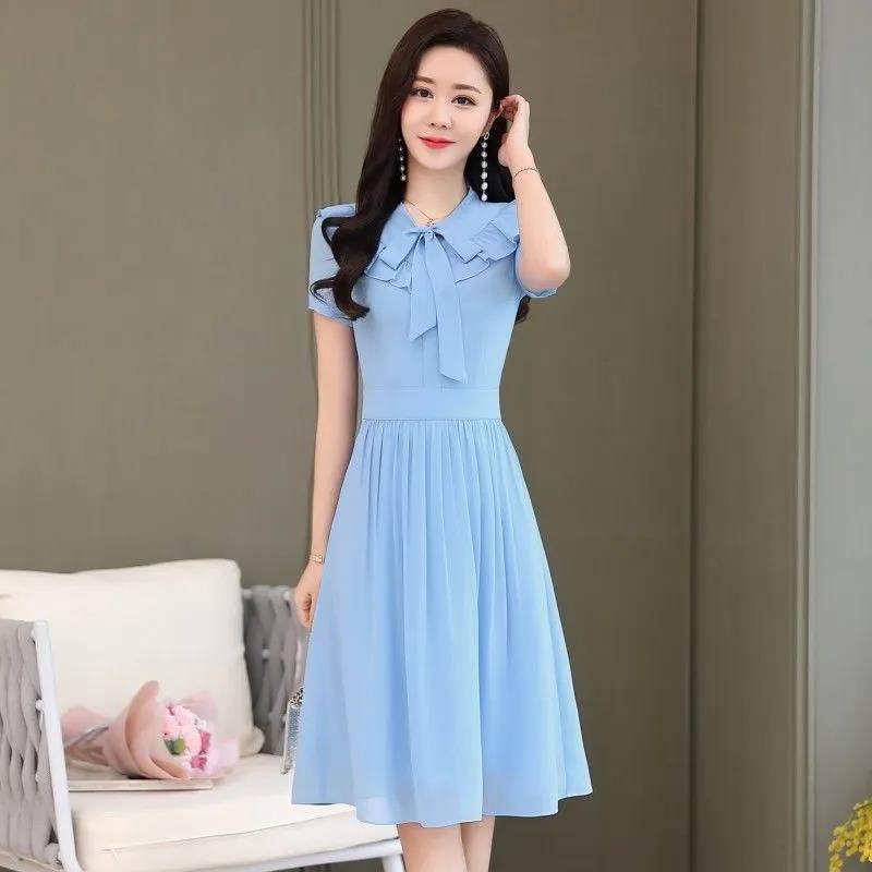 Women's Summer Skirt V-Neck Sweet Solid Color Tie Bow A-Line Dress