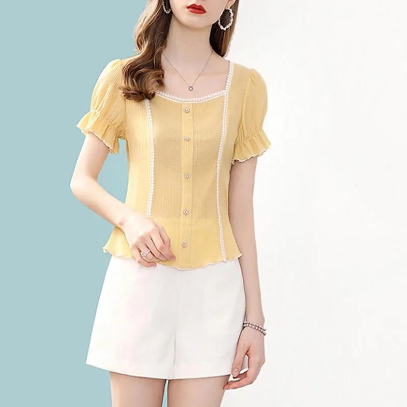 Women's Summer Square Neck Top Loose Chiffon Puff Sleeves