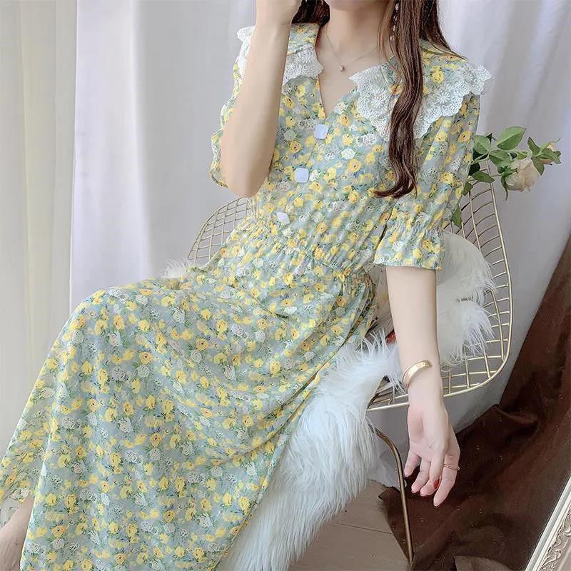 Women's Summer Sweet Short Sleeve Long Floral Dress Doll Collar Thin A-line Skirt