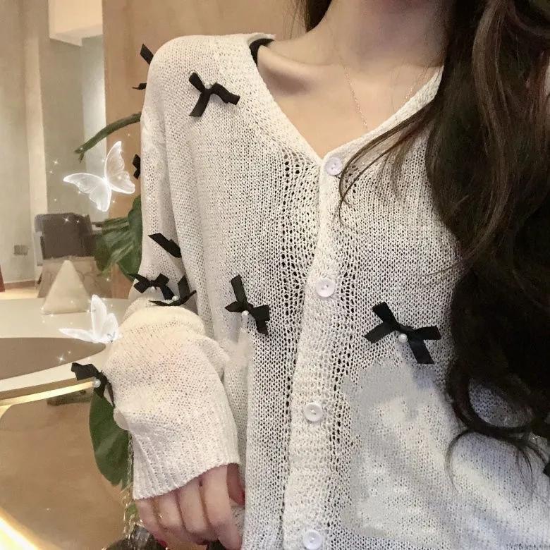 Women's Thin Coat Summer Bow Sunscreen Cardigan White Loose Coat Long-sleeved Knitted Sweater Women V Neck Button Hollow Out Tops Cute Blouse Sweater