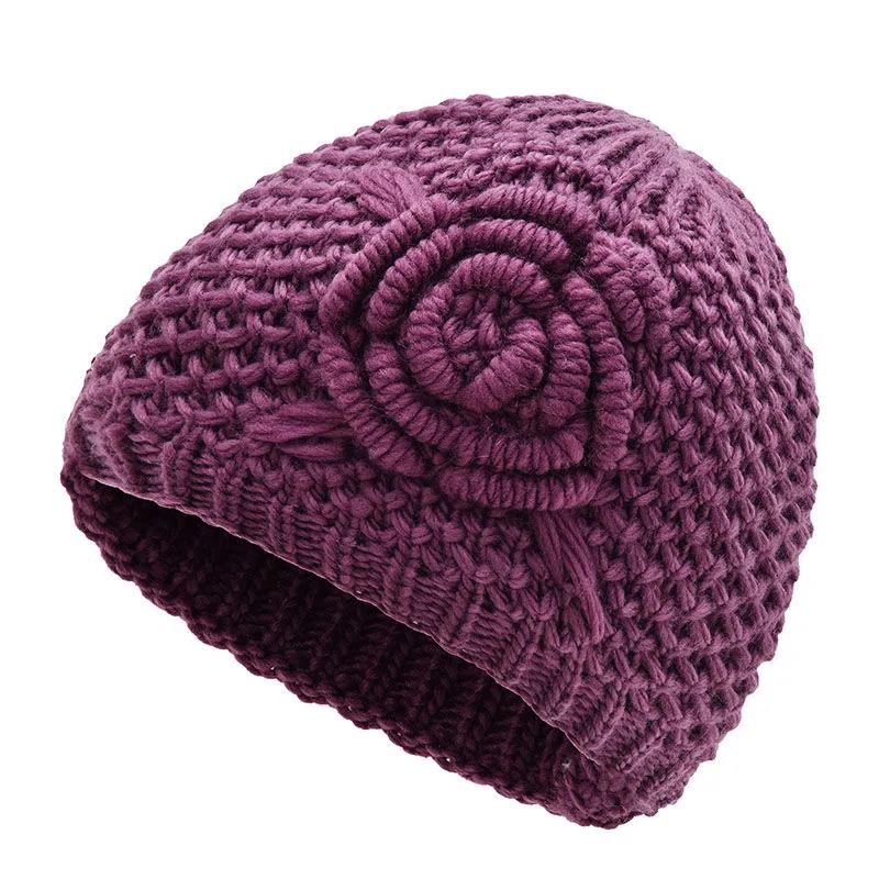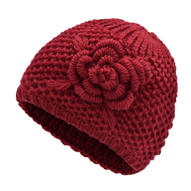Women's Winter Vintage Floral Knitted Wool Plus Velvet Warm Hats Grandma Mothers Mother-in-law Hats Handmade Flower Knitted Padded Hat