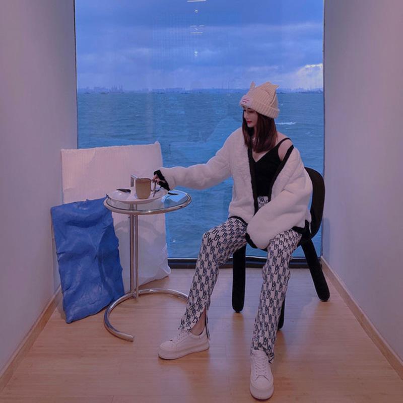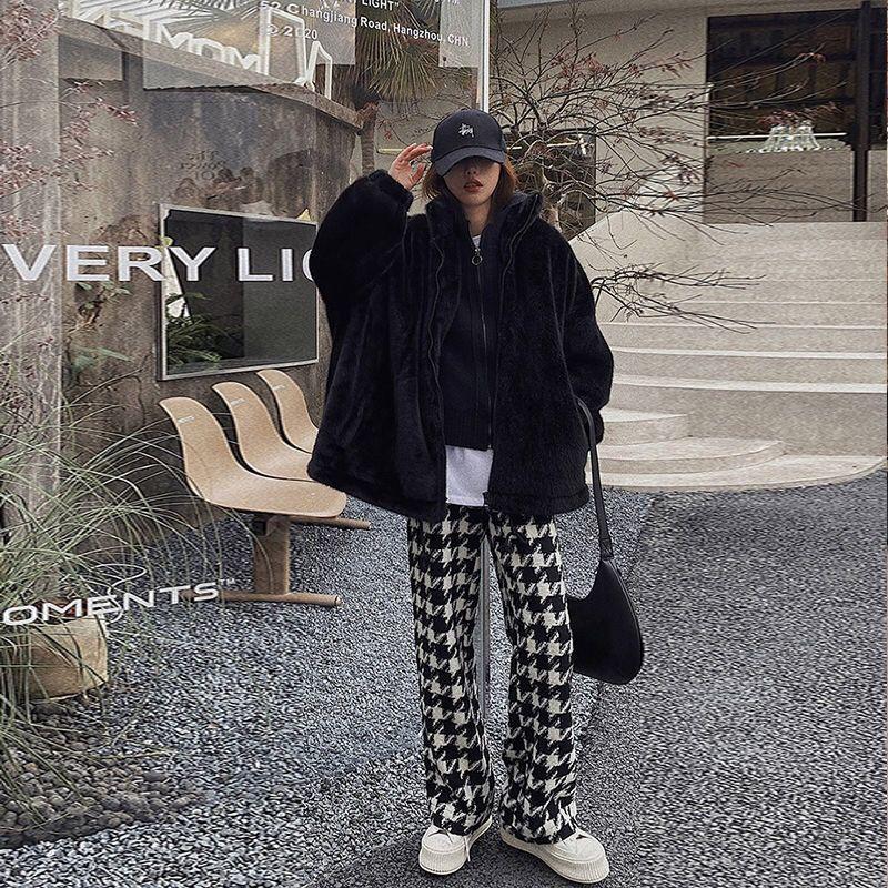 WTEMPO Women's Wide-leg Pants Black and White Grid Houndstooth Super Long Mid-waist Straight Loose Casual Daily